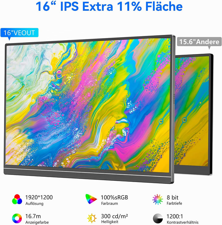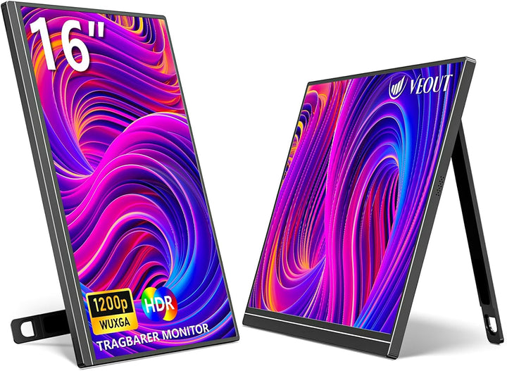Veout 16 Zoll Portable Monitor, 1200P 2K IPS Tragebar Gaming Bildschirm für Laptop/PC/Mac/PS5/Xbox mit USB-C & HDMI, Ultradünn Display mit Halterung,16:10, 300cd/m² Helligkeit - Schwarz
