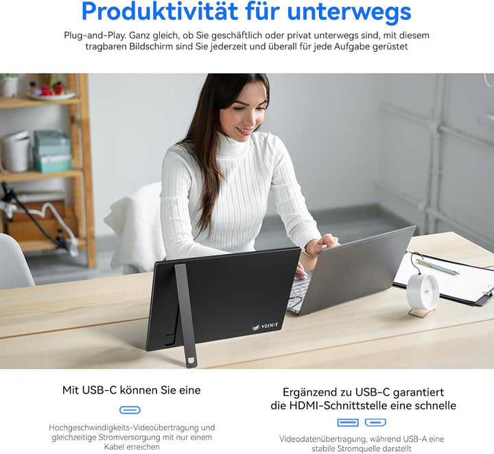 - 【Maximale Produktivität】Verwenden Sie den Veout Portable Monitor als zweiten Bildschirm von PC oder Laptop, um mehrere Anwendungen gleichzeitig auszuführen, ohne ständig zwischen ihnen wechseln zu müssen. Es eignet sich gleichermaßen für Geschäftspräsentationen, Kursarbeiten, Grafikdesign, Gaming, Preisvergleiche beim Einkaufen und Musikproduktion. Der integrierte Ständer unterstützt eine Blickwinkelverstellung von 0 bis 75 Grad und bietet einen stabilen Halt, während Sie je nach Präsentationsinhalt schnell zwischen Quer- und Hochformat wechseln können.